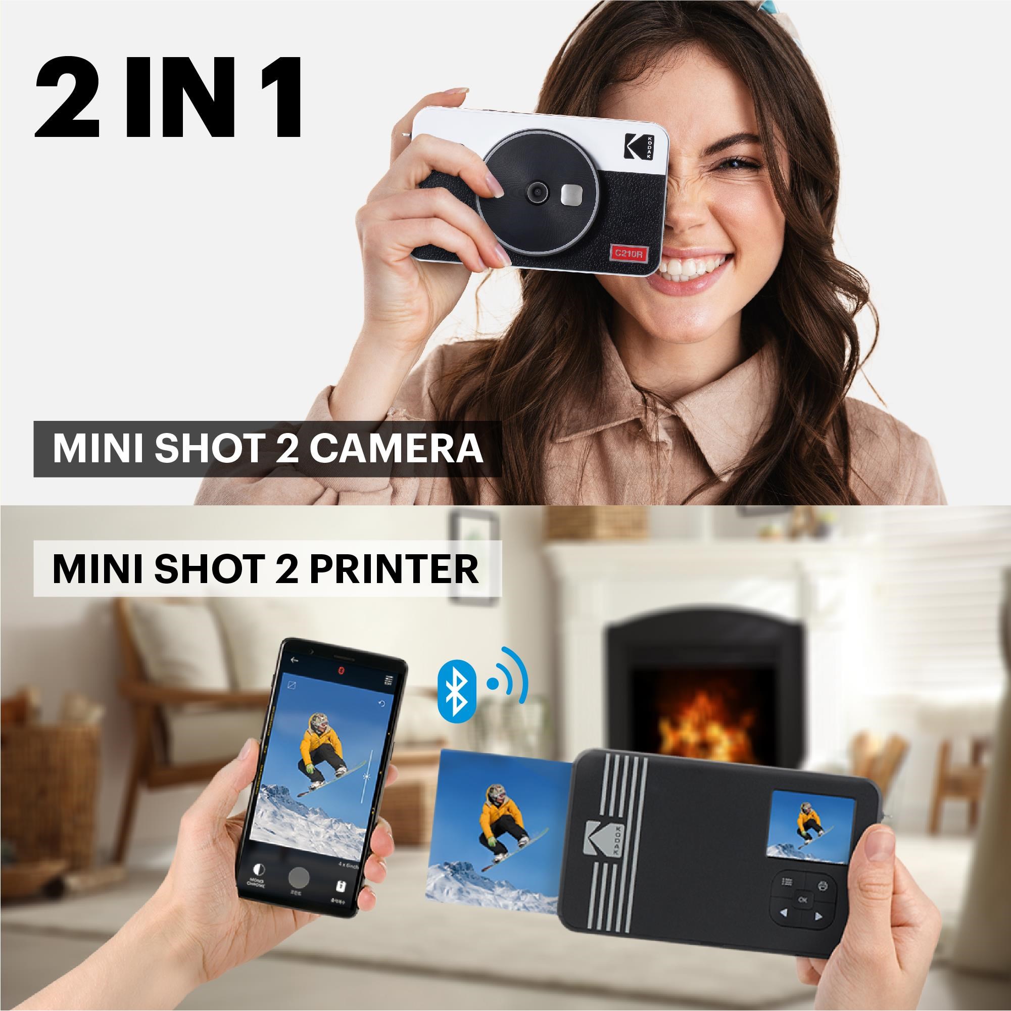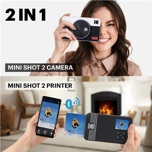 Point. Shoot & Print - Instantly! Kodak Mini Shot 2 Retro allows you to shoot and print snapshots anytime and anywhere! Print them directly from the Kodak Mini Shot 2 Retro or connect it to any mobile device via Bluetooth to print from the photo gallery quickly and effortlessly.