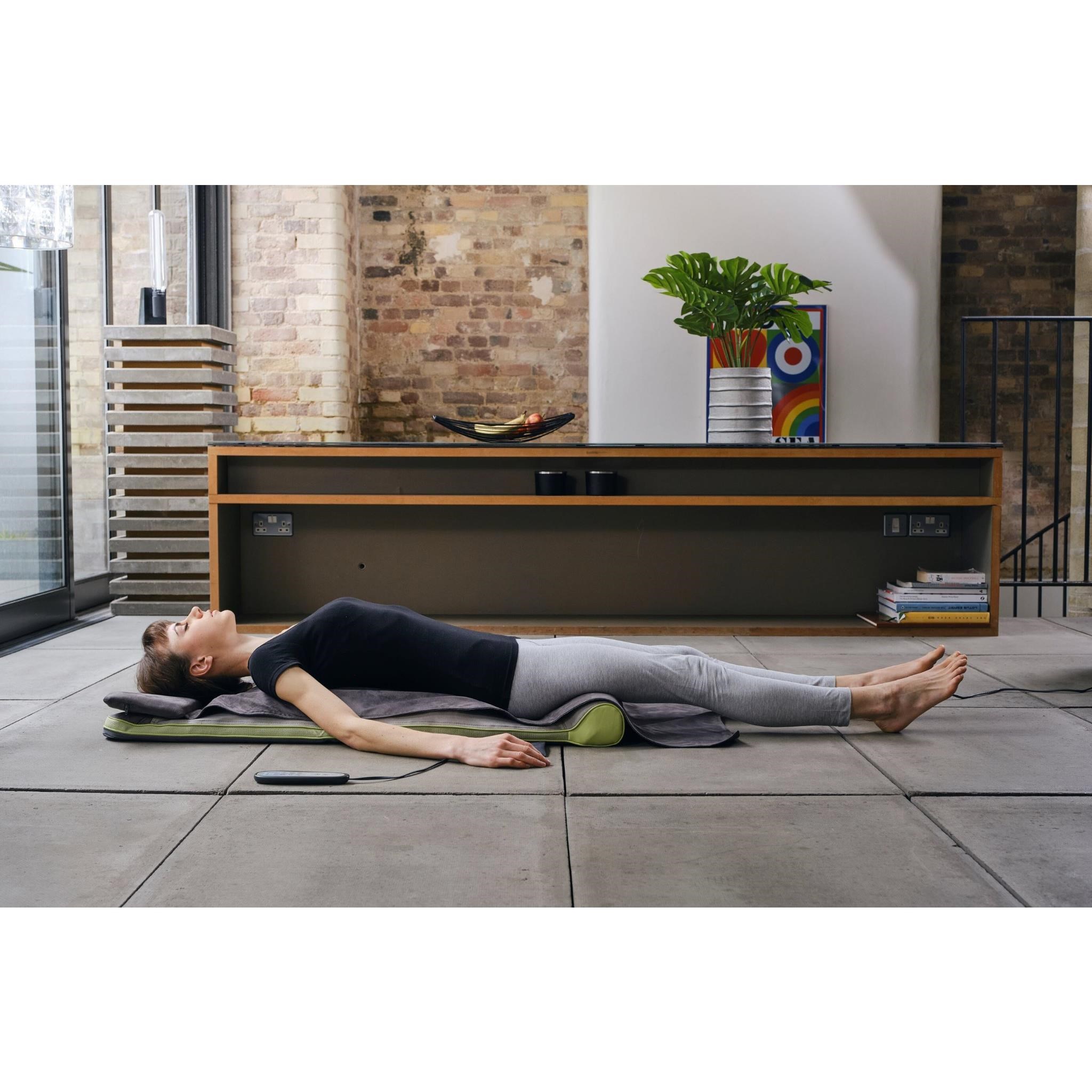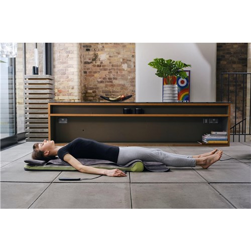 A stress relieving. tension reducing. and relaxation focused back stretching mat. Lay back and relax as STRETCH+ PLUS moves your body through a gentle yet powerful sequence of yoga inspired stretches and twists. An effortless way to experience the relaxing benefits of yoga. STRETCH+ PLUS guides you through a range of 6 sequences. calming and gently encouraging your body to stretch and unwind from the comfort of your home.