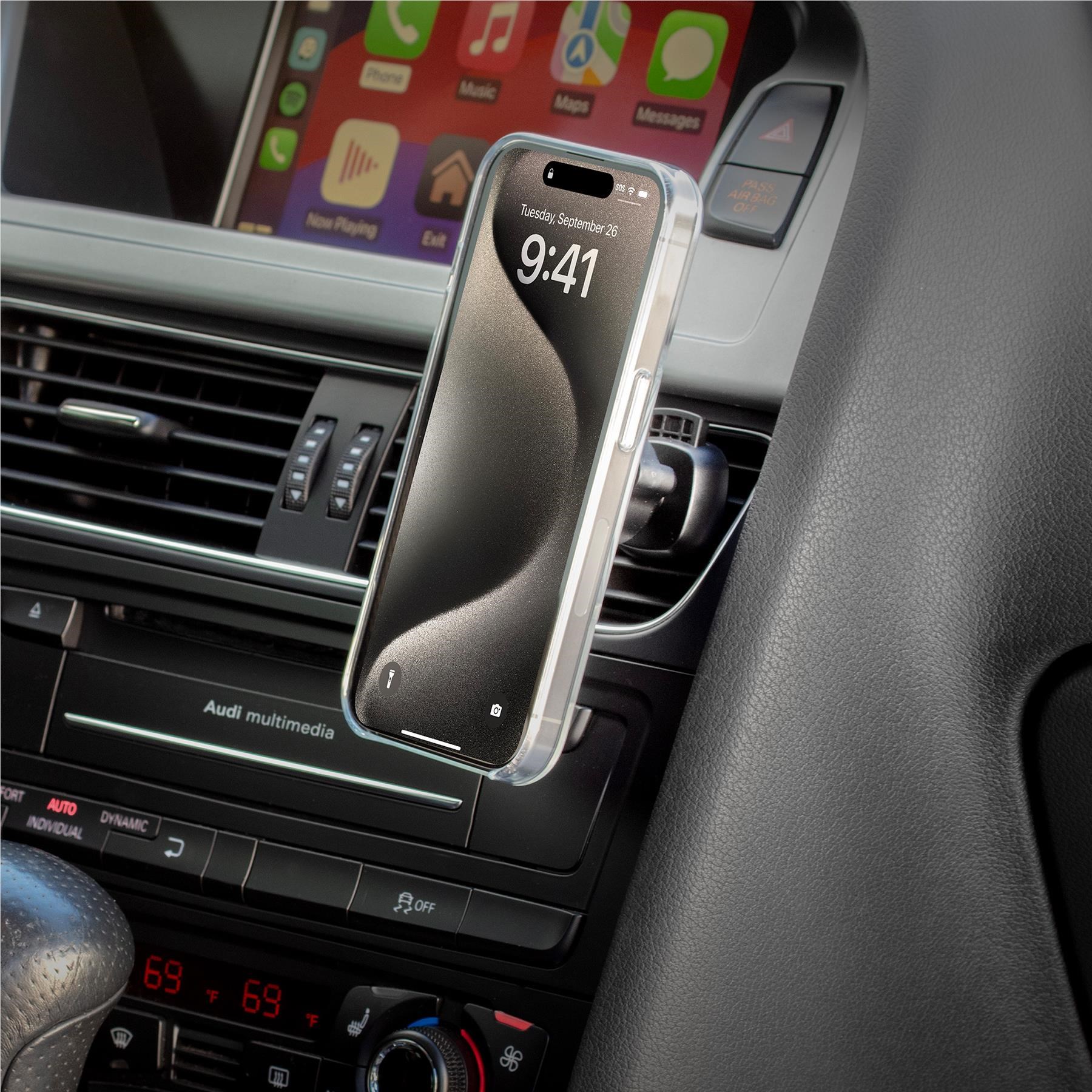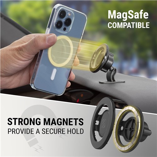 Add convenience and safety to your vehicle with this small. powerful magnetic mount that securely holds MagSafe® phones for hands-free use. Holds MagSafe® iPhone models 12 and later using their built-in MagSafe® magnets. Also holds iPhone models X 11 & SE and Android phones using the MagicRing Adapter. Mount attaches to top or front of dash using automotive grade adhesive. Vent-mounting option suits most vehicle vents and is easy to install and swap between vehicles.