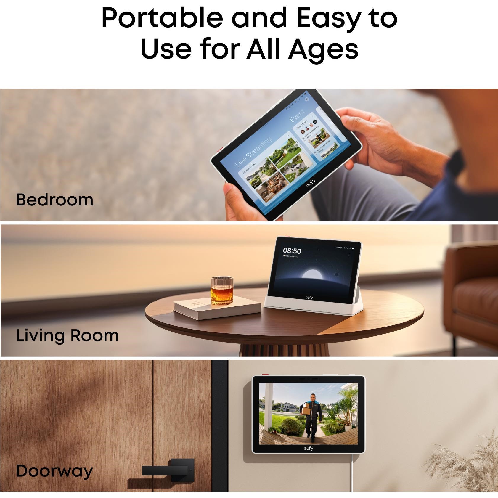 Portable. battery-powered. and adaptable for wall-mounting or docking. Features one-touch alarm and group device controls—designed for intuitive use by the whole family. from children to seniors.