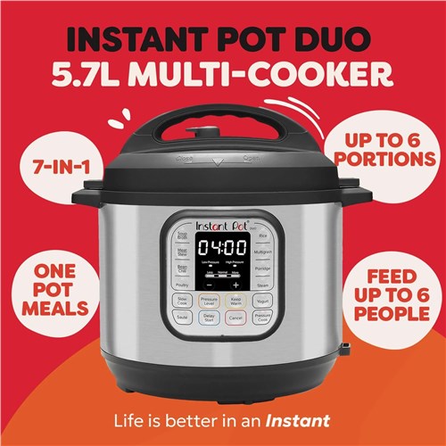 This multi-cooker replaces 7 appliances. including a pressure cooker. slow cooker. rice cooker. steamer. sauté pan. yoghurt maker and food warmer so you can save space on your benchtop. Cook with confidence thanks to over 10 built-in safety features. including overheat protection and a secure locking lid. The Duo 5.7L makes meal prep convenient. clean-up simple and lets you enjoy large family meals. effortless entertaining and delicious results every time.
