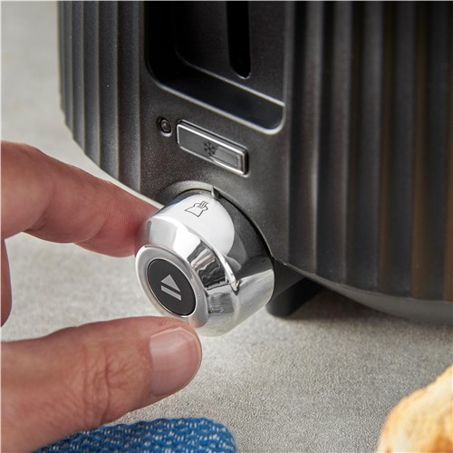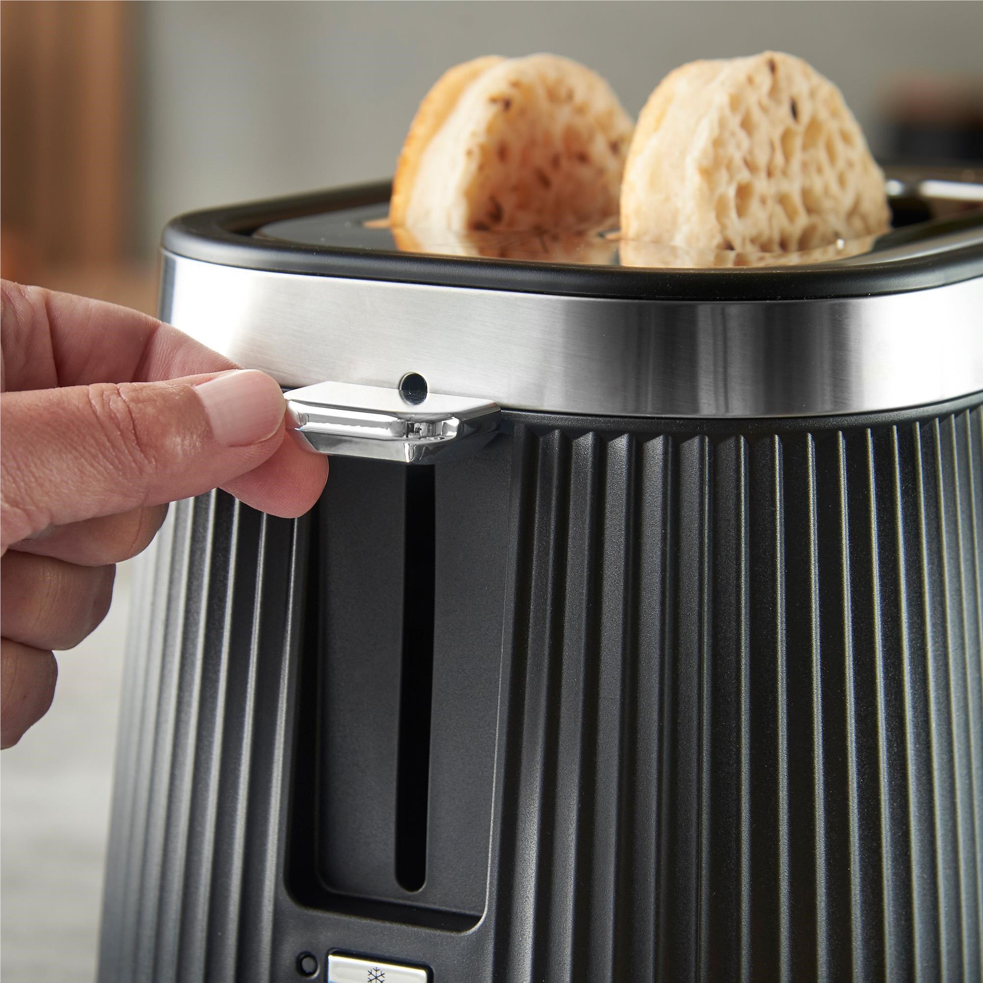 An elegant matte black fluted exterior sits in contrast to the brushed stainless-steel trim making the Russell Hobbs Brontë 2 Slice Toaster a stylish addition to your kitchen worktop. Check to see if your slice is just how you like it without stopping the cycle with the Lift and Look feature. And the high lift lever lets you retrieve smaller snacks like bagels without risking your fingers in the heat. Whether you forgot to get your bread out of the freezer. or you’ve let your bagel go cold. there’s a setting to help you toast the perfect breakfast with the frozen. reheat and cancel functions. The indicator light shines until your perfect slice pops or you can heat up a fresh pastry on the bun warmer for a little extra indulgence.