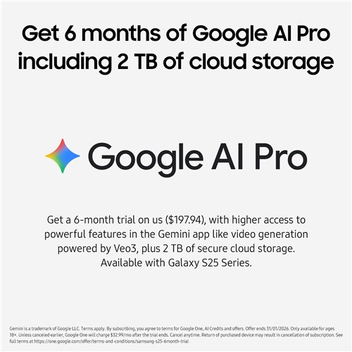 Whether it’s work. creativity or play. do more effortlessly everyday with your ultimate AI companion1. Speak naturally with Gemini Live1.3 to get information in real time. Share your moments through the camera to ask for advice or ideas. Express your style with a range of colours to suit your style and explore a new level of premium  productivity and creativity with the Galaxy S25 FE.